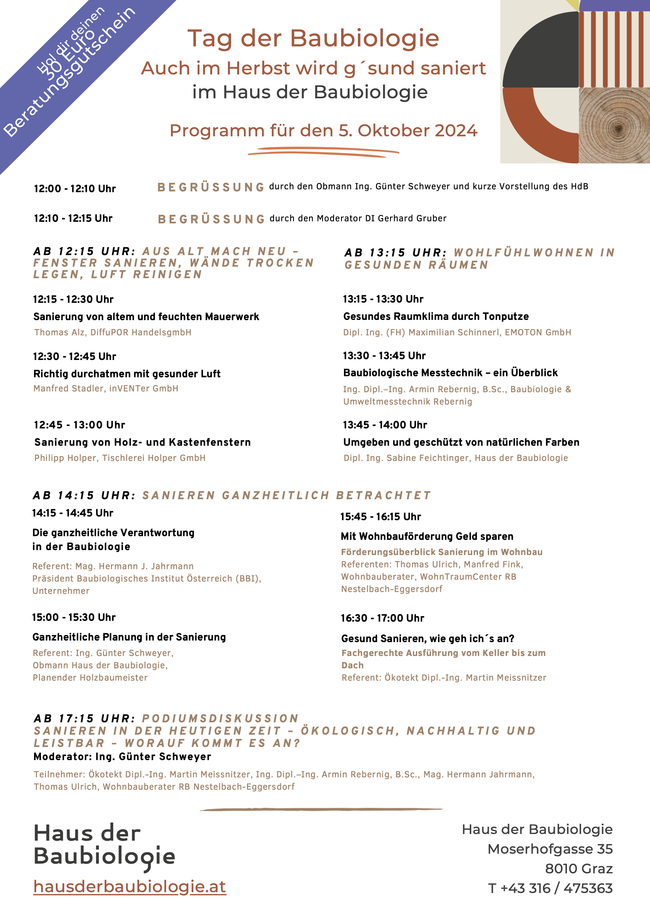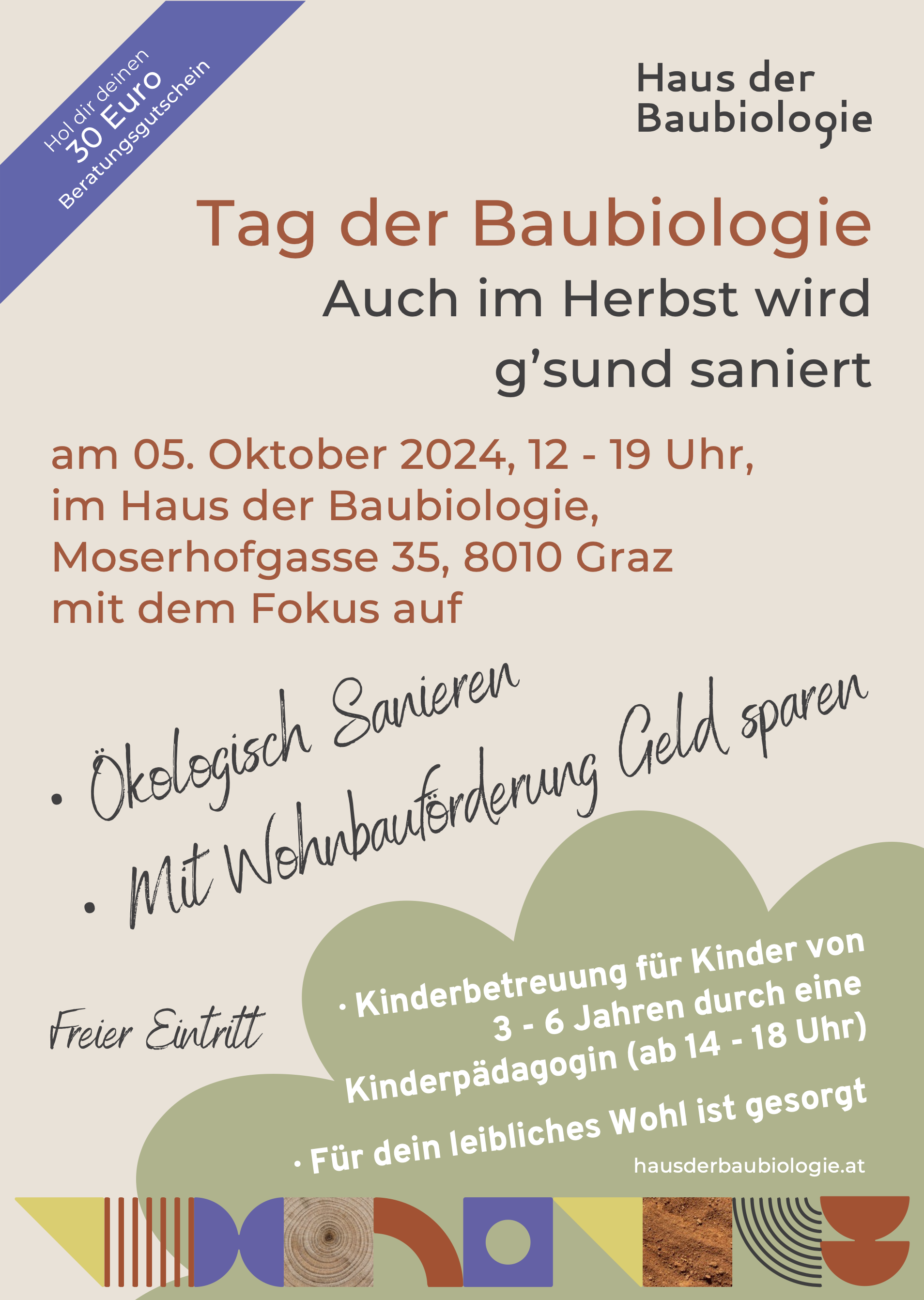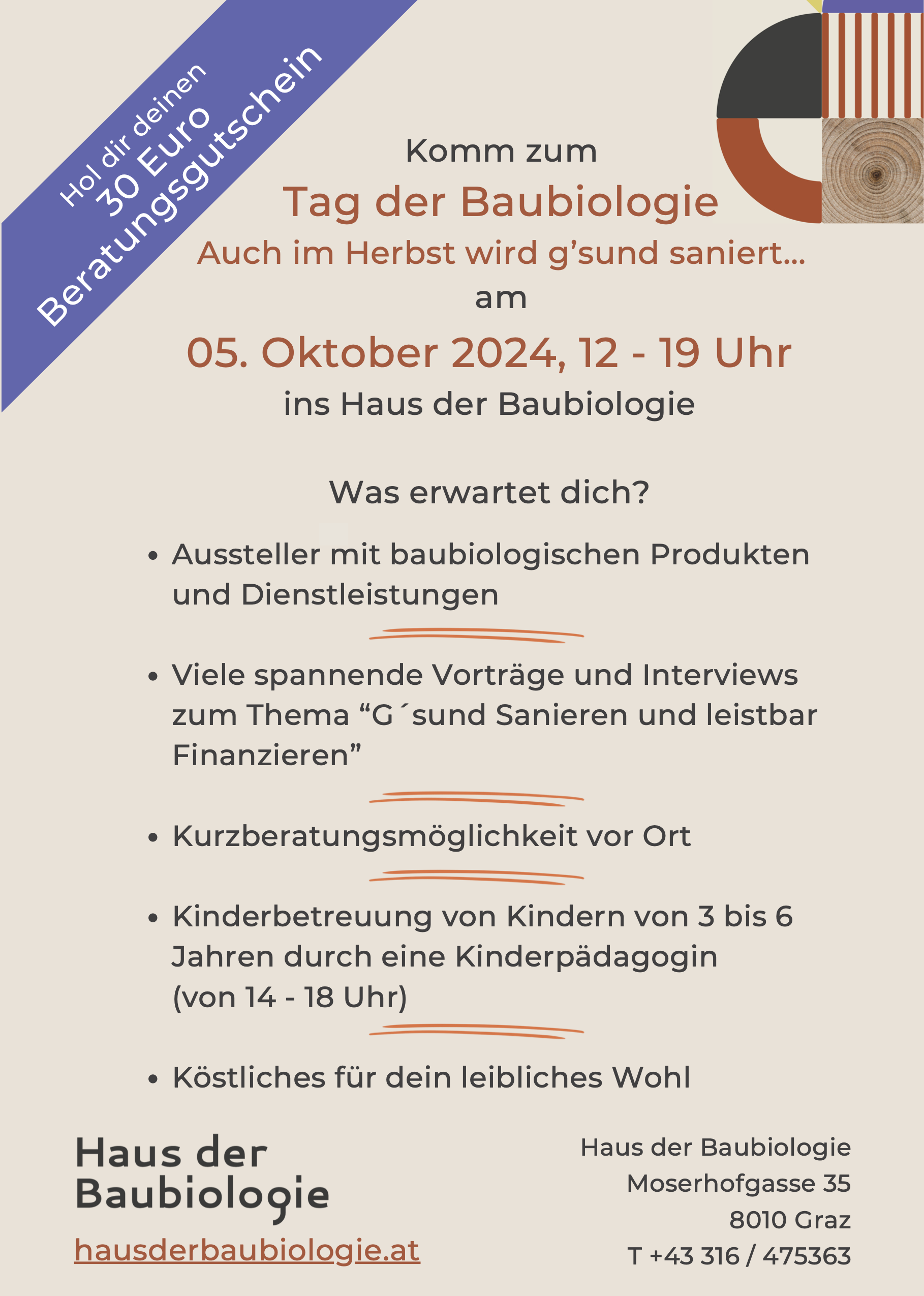Auch im Herbst 2024 gibt es wieder den gerne besuchten “Tag der Baubiologie” im Haus der Baubiologie in Graz.