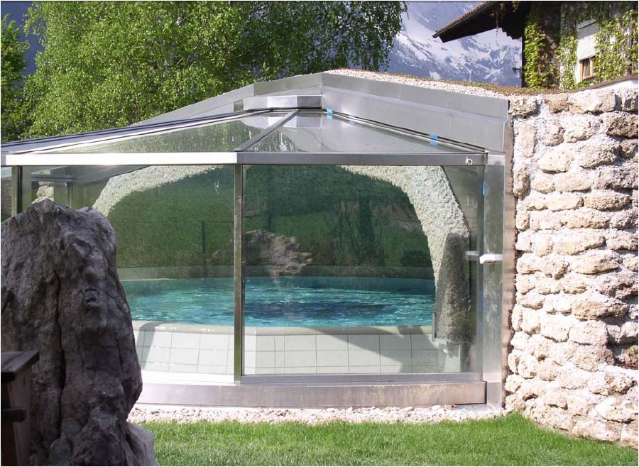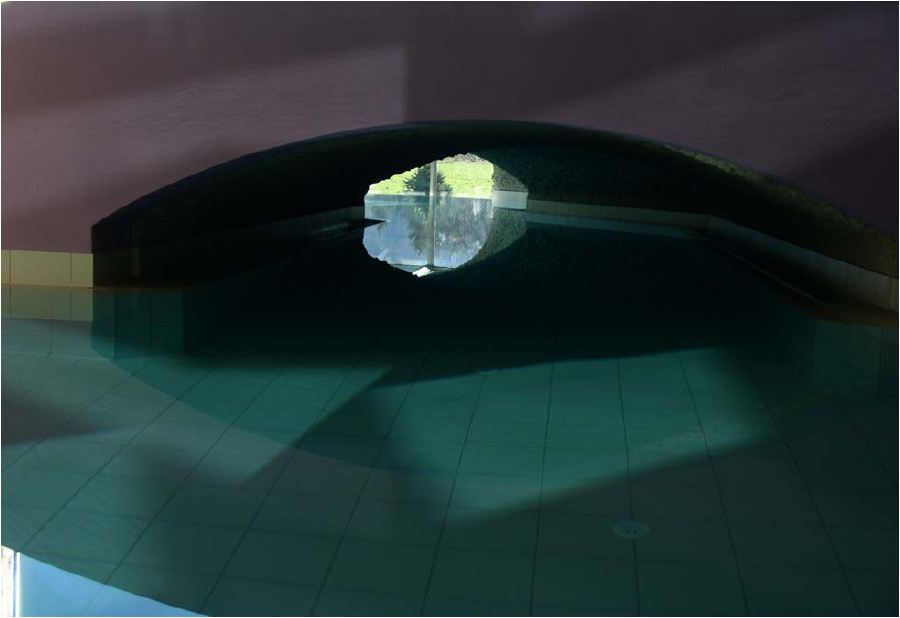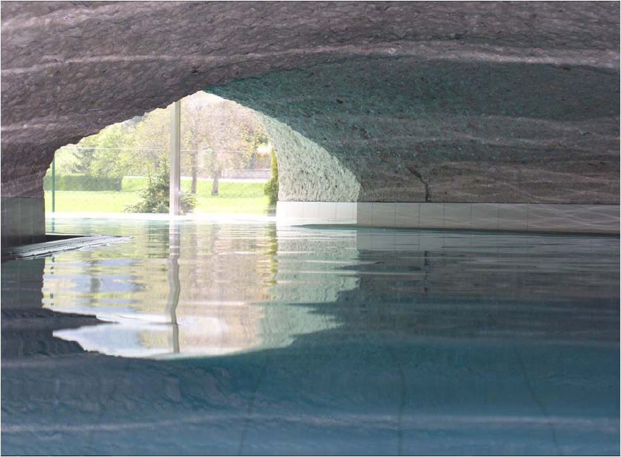 Das Wasser ist das verbindende Element zwischen dem Innen und Außen. Vom Becken im Haus führt der Schwimmstollen in den Garten. Der Stollen ist wahrscheinlich der einzige künstlich in Konglomerat gefertige Stollen in Österreich. Das Becken am Ende des Stollens ist zur Hälfe verglast ist und den Blick Richtung Himmel ermöglicht. Die Glasfronten lassen die Grenzen zwischen freier Natur und geschütztem Bereich verschwimmen. Die aufgesetzte Kuppel ist offenbar und begrünt.