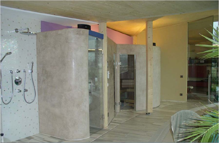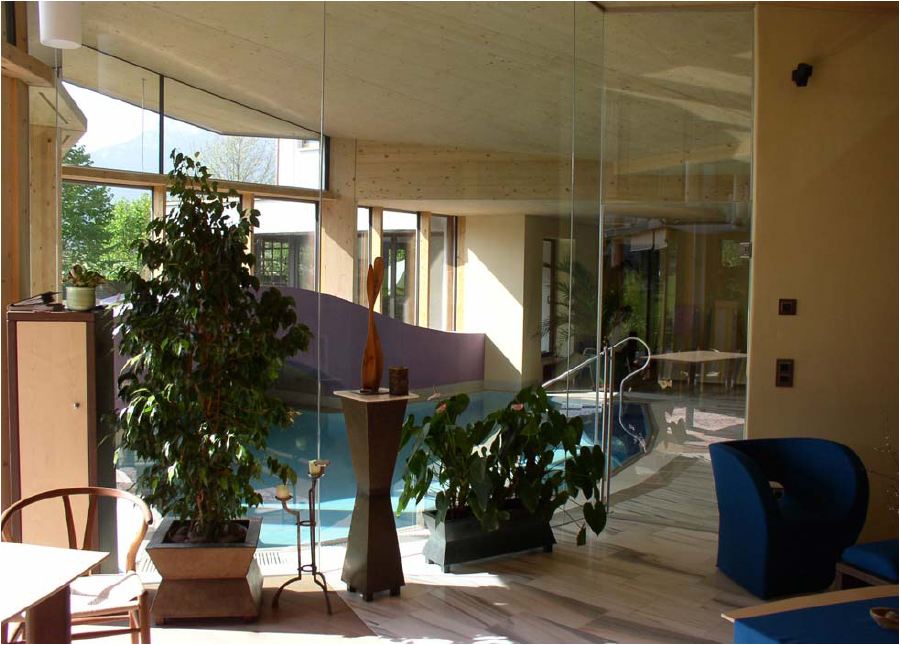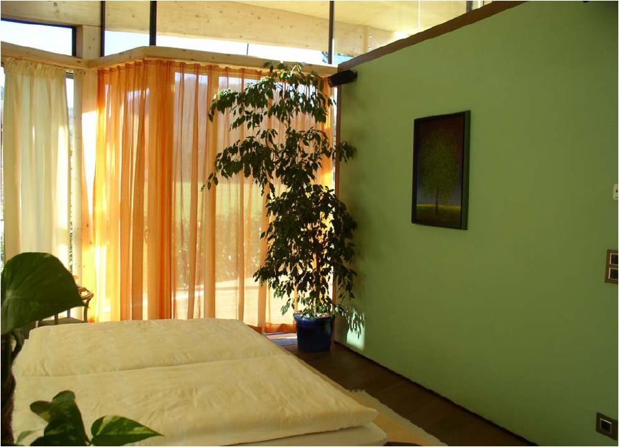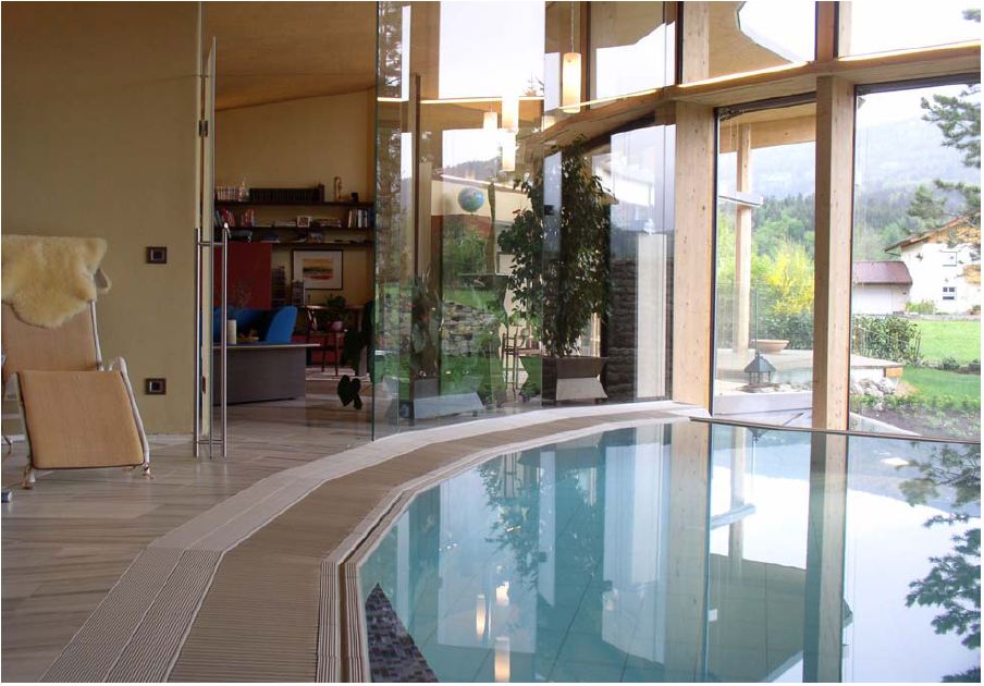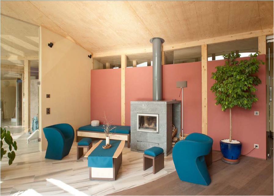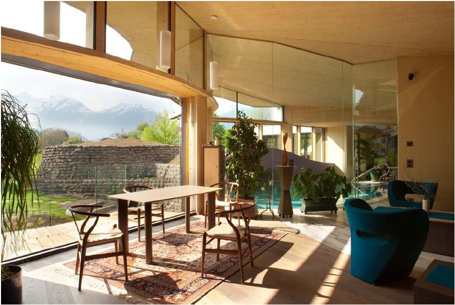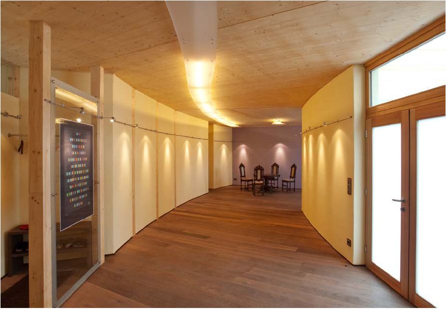 Der Schwimmstollen wirkt tatsächlich wie ein natürlicher Stollen. Er wurde aus Konglomeratstein gefertigt und spiegelt die Gebirgsstruktur umliegender Berge wieder. Die Primärkonstruktion des Hauses und Teile der Innenwände wurde in Holzmassiv (Kreuzlagenholz) errichtet. Besonders auffällig die weit gespannte Holzdecke, die erkennen lässt wie anpassungsfähig Holz auch bei ungewöhnlichen Lösungen sein kann. Im Innenbereich wurden die Deckenelemente sichtbar in Holz belassen, Wandelemente mit Lehm verputzt. Massive Eichenhölzer für Möbel und heimischer Marmor beweisen die Vielfältigkeit natürlicher Werkstoffe und führen zu einer besonderen Lebendigkeit. Schon in der Planungsphase spielte das Thema Farbe hinsichtlich beabsichtigter Raumwirkungen eine ganz wesentliche Rolle. Den gewählten Farben liegt ein persönliches Farbprofil, das mit Hilfe eines Codierverfahrens erstellt wurde, zugrunde. Material, Form, Farbe verschmelzen mit dem Menschen zu einer Einheit. In Bad und Sauna wurde mit Tadelakt, einem alter Traditionen im Bäderbereich entstammenden und besonders widerstandsfähigem Material auf Kalkbasis gearbeitet. Es ermöglicht besondere Lebendigkeit und spricht haptisch an, wie überhaupt den vielfältigen Möglichkeiten der Wahrnehmung maximal Raum gegeben wurde, ohne gleichzeitig Unruhe zu schaffen.