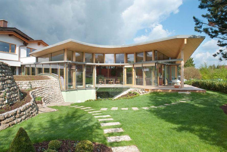 Das Haus wurde in einer Holzmischbauweise errichtet. Gerade Außenwände in Holzmassivbauweise, gekrümmte Wände in Holzständerbauweise. Die geneigte Dachfläche wurde als monolithische Holzmassivplatte mit einer freien Spannweite bis zu 8 m ausgeführt.